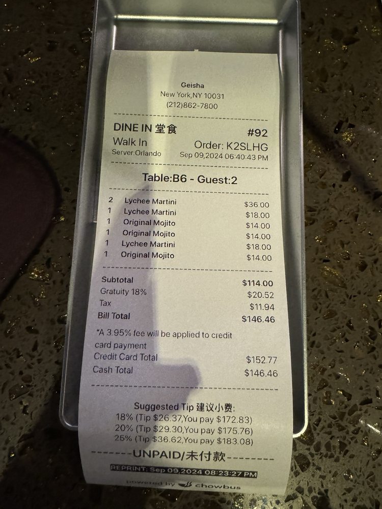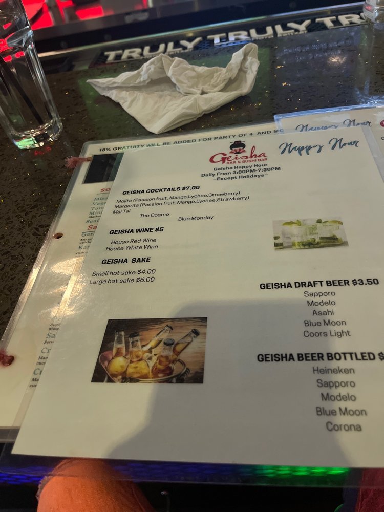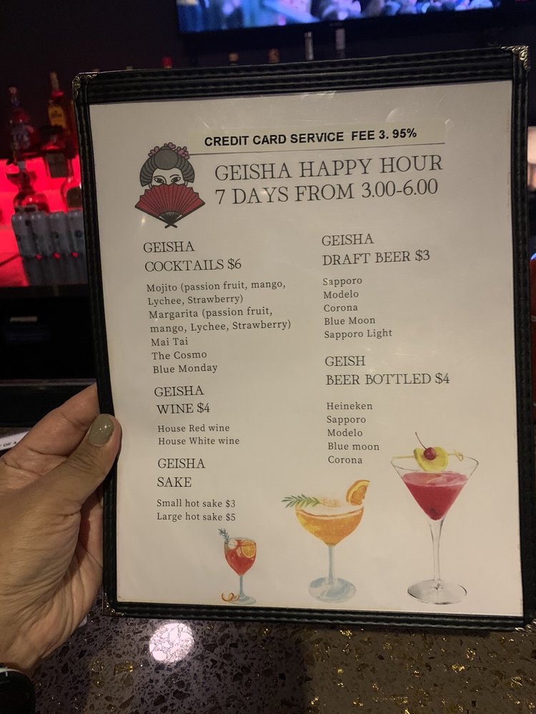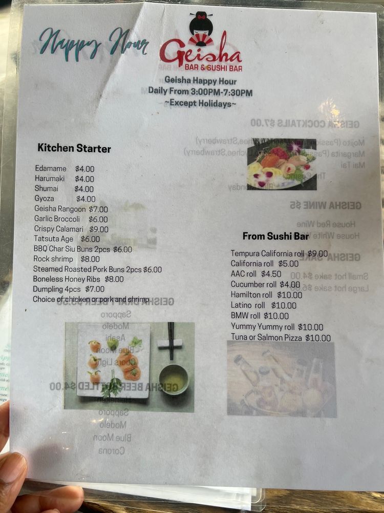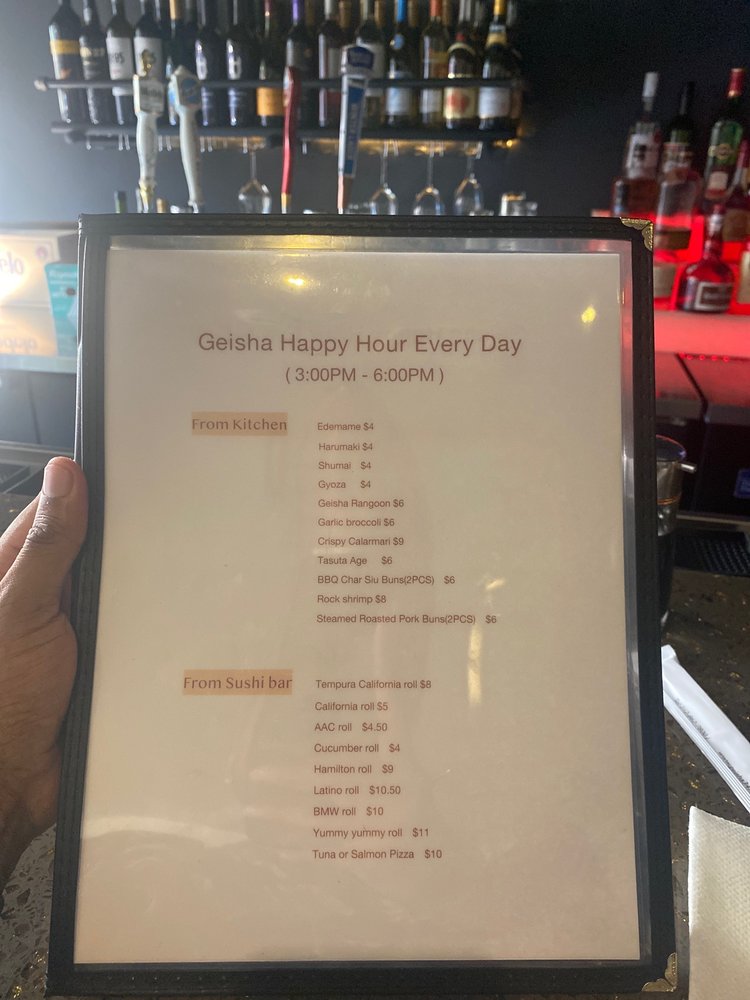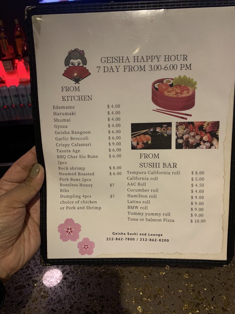 Geisha Sushi, located in New York, offers a unique blend of Japanese and Chinese cuisine with Latin accents. With a diverse menu including vegan and vegetarian options, this casual and intimate spot also features a full bar with happy hour specials. Customers praise the delicious food and friendly service, highlighting the large menu and affordable prices. Whether you're in the mood for sushi rolls, bento boxes, or cocktails, Geisha Sushi promises a memorable dining experience. The ambience is praised for being welcoming and the staff efficient and accommodating. With happy hour deals, strong drinks, and a variety of fresh sushi options, Geisha Sushi is a go-to spot for a satisfying meal in a vibrant setting.