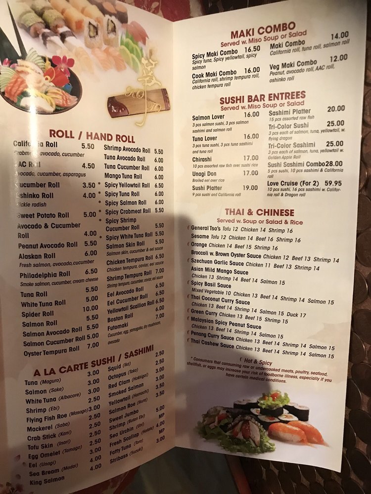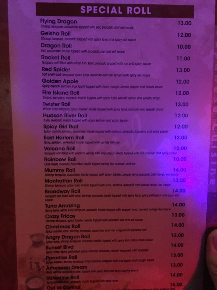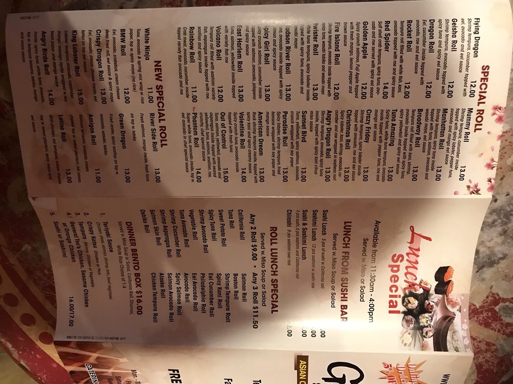 good for 5 peopleYummy Yummy Roll, Crispy Duck Roll, Hamilton Roll, Fire Island Roll, Tempura California Roll, Latino Roll, Dragon Roll